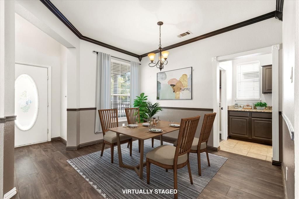 Welcome to this expansive two-story home located in the master-planned community of Providence Village. A charming front porch sets the tone as you enter into a thoughtfully designed home spanning 2,600 square feet of living space. Inside, you’re greeted by wood-look laminate flooring, soaring 19-foot ceilings, and a formal dining area that flows seamlessly into the heart of the home. The open-concept layout is ideal for entertaining, featuring an expansive living room with a cozy wood-burning fireplace and uninterrupted sight-lines into the kitchen and breakfast area, perfect for hosting gatherings both large and small. The kitchen is well-equipped for entertaining and everyday living, offering generous prep space with granite counter-tops, stainless steel appliances, convection oven, island, and a butler’s pantry for added storage and convenience. The first-floor primary suite provides a private retreat with an ensuite bath complete with dual sinks, a garden tub, separate shower, and a walk-in closet. Upstairs, the home truly shines as an entertainer’s space with a large game room and an oversized media room, ideal for movie nights, game days, or relaxing with family and friends. Three additional bedrooms and a full bath complete the second level, including one bedroom with access to a private balcony. Residents of Providence Village enjoy access to a variety of community amenities, including a resort-style pool, clubhouse with fitness center, scenic lake, fishing, walking trails, and more.