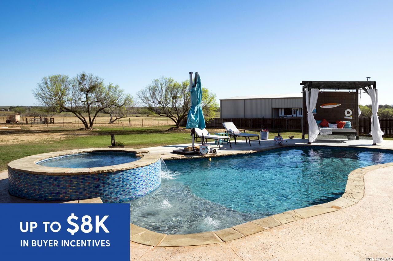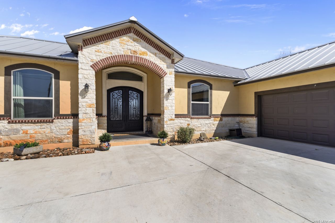 Welcome to 109 Colibro Creek in La Vernia, TX 78121. This absolutely gorgeous single story home sits on a full acre in a quiet one street community with only 12 homes. Offering over 2,700 square feet, this 4 bedroom, 3.5 bath residence is filled with quality details throughout. From the moment you arrive, the oversized metal front doors make a stunning first impression. Inside, you will find an open floor plan with LVP flooring and hand textured walls. The spacious living room features a beautiful fireplace and flows seamlessly into the large kitchen, creating the perfect space for everyday living and entertaining. The kitchen offers a generous island, stainless steel appliances, abundant cabinet space, and plenty of room to gather. The primary suite is a true retreat with a large bedroom and a luxurious bathroom that includes a whirlpool tub, separate shower, dual vanities, and his and hers walk in closets. One secondary bedroom has its own full bath, while two additional bedrooms share a convenient Jack and Jill bathroom. There is also an additional half bath for guests. At the front of the home, you will find a dedicated office space. A large utility room and an extra wide two car garage provide added functionality. This all electric home is built for efficiency with spray foam insulation and a durable metal roof to help keep energy costs down. Step outside to enjoy the covered back patio overlooking a beautiful in ground pool and a spacious backyard with plenty of room to relax or entertain. If you are looking for space, privacy, and quality craftsmanship in La Vernia, this home has it all.
