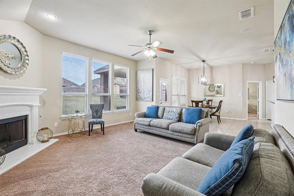 Beautiful single story home on large home site! Plenty of space between homes and large backyard. Stunning curb appeal with stone elevation, front porch, and stone-brick landscape border. Tile floors adorn the entry, halls, kitchen & dining room. Wood floors in the study. Family room features fireplace and in wall speakers. Gourmet kitchen with granite counters, center island, skylight, and pendant lights. Primary Bedroom is perfect for king size furniture. Primary bath with dual sinks, separate shower, & garden soaking tub. Backyard with covered patio and music speakers is perfect for outdoor living & entertaining. Shed for additional storage. This home is a MUST SEE!
