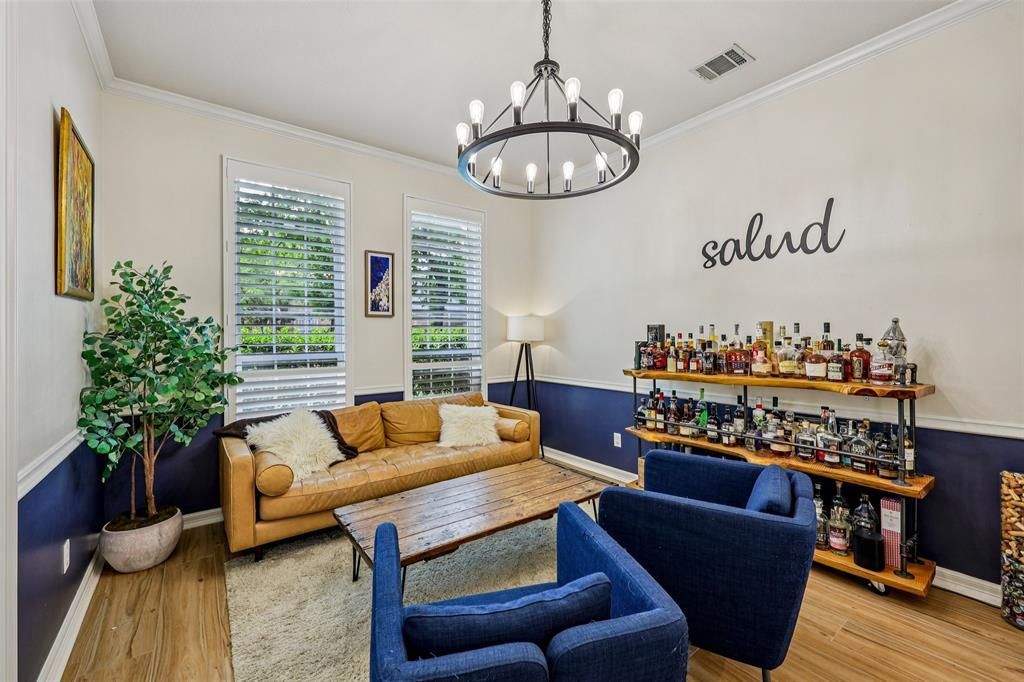 This home is stunning! You will love walking into this beautifully updated 4-bedroom, 4-bathroom home boasting 3,637 square feet of well-designed living space, perfect for family living and entertaining. Step in to the beautiful foyer to find the warm wood-look tile extending throughout the first floor. Move effortlessly to the inviting formal living room graced with custom library-style book shelves extending to the ceiling, beautifull marble mosaic tile accented gas fireplace and gleaming Pella windows (2020) that bring in the natural light and offer a glimpse of the oasis outside. Continue on to the custom wine bar and find your way to the gorgeous kitchen (2022) where quartz counters highlight the shaker style white cabinetry complete with under and above cabinet lighting. Step outside to the covered patio, beautiful pool, large grass space, fire pit area, and custom shed (2025) creating a space for relaxation and entertainment. At the end of the day escape to the primary suite complete with spa inspired bathroom. The garden tub is the perfect place to unwind and the glass enclosed shower and separate vanities give everyone plenty of space. Upstairs you'll find a beautiful ensuite bedroom, spacious game room and a second beautiful bedroom, additional full bath with large storage space. Close the iron driveway gate and create your private courtyard in front of the attached 3-car garage. Located in a serene neighborhood, this home combines modern updates with personality that makes this home feel special.
