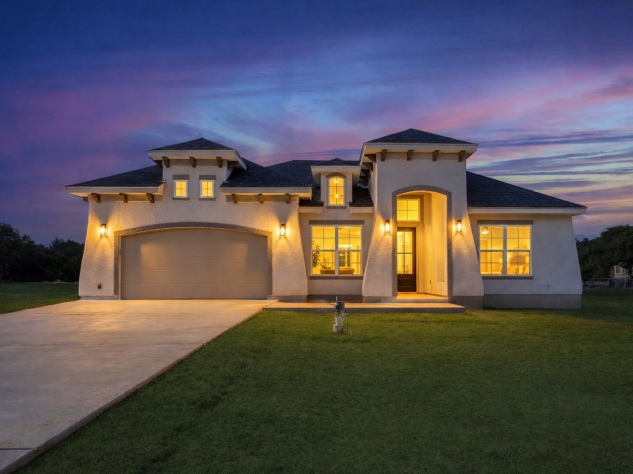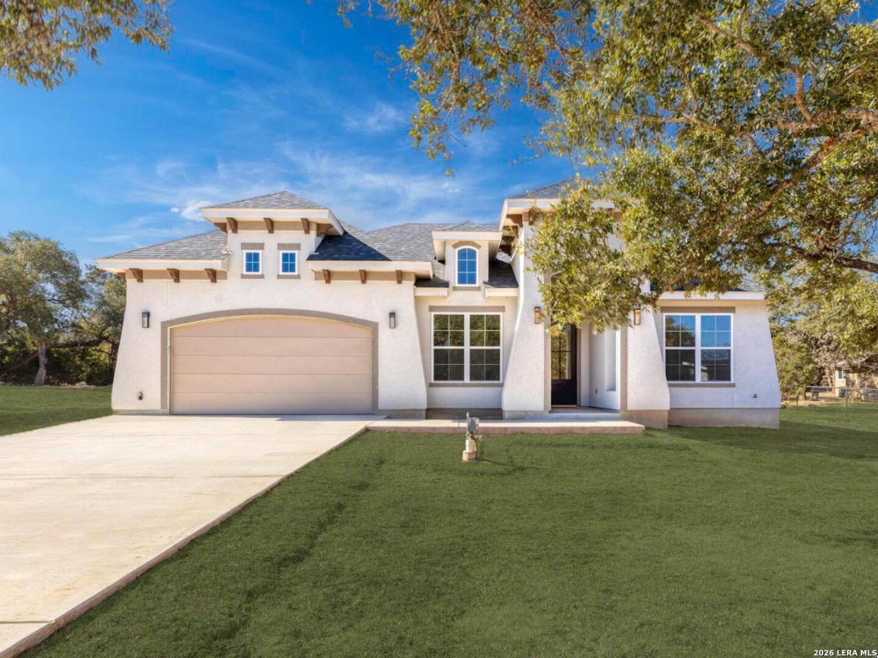 **OPEN HOUSE Sunday MARCH 22, 10AM-3PM** Stunning NEW CONSTRUCTION, single-story luxury home on a half-acre in the heart of the Texas Hill Country. This elegant 4-bedroom, 3-bath residence offers 2,638 square feet of thoughtfully designed living space, blending modern finishes with timeless Hill Country charm. An inviting elongated entry welcomes you with soaring ceilings, natural light, and custom design elements throughout. Two spacious secondary bedrooms share a Jack-and-Jill bath, while a front bedroom with its own full bath offers flexibility for guests, a home office, or multigenerational living. The open-concept living, kitchen, and dining area is ideal for entertaining and everyday living, filled with natural light from oversized windows. The chefs kitchen features granite countertops, a striking metal vent hood, built-in microwave, custom soft-close cabinetry, an oversized walk-in pantry, and a large island with seating.The living room is anchored by a sleek electric fireplace and dramatic ceiling height. The private owners suite is a true retreat, offering a spacious walk-in closet and spa-like bath with a freestanding soaking tub, dual-entry walk-in shower with dual shower heads, built-in bench, storage niches, double vanity, and oversized mirror. Additional highlights include a mudroom off the two-car garage, a large laundry room with custom cabinetry and counter space, and quality finishes throughout. Enjoy Hill Country living from the covered back porch with beautiful beams, high ceilings, and a ceiling fan-perfect for relaxing while deer and wildlife roam freely. Located in Rivermont, residents enjoy exceptional amenities including Guadalupe River access, a 6-acre river park, pool, pavilion, playground, tennis and basketball courts, picnic areas, and more. Modern luxury, peaceful surroundings, and convenient access to the city, Schedule your showing today!
