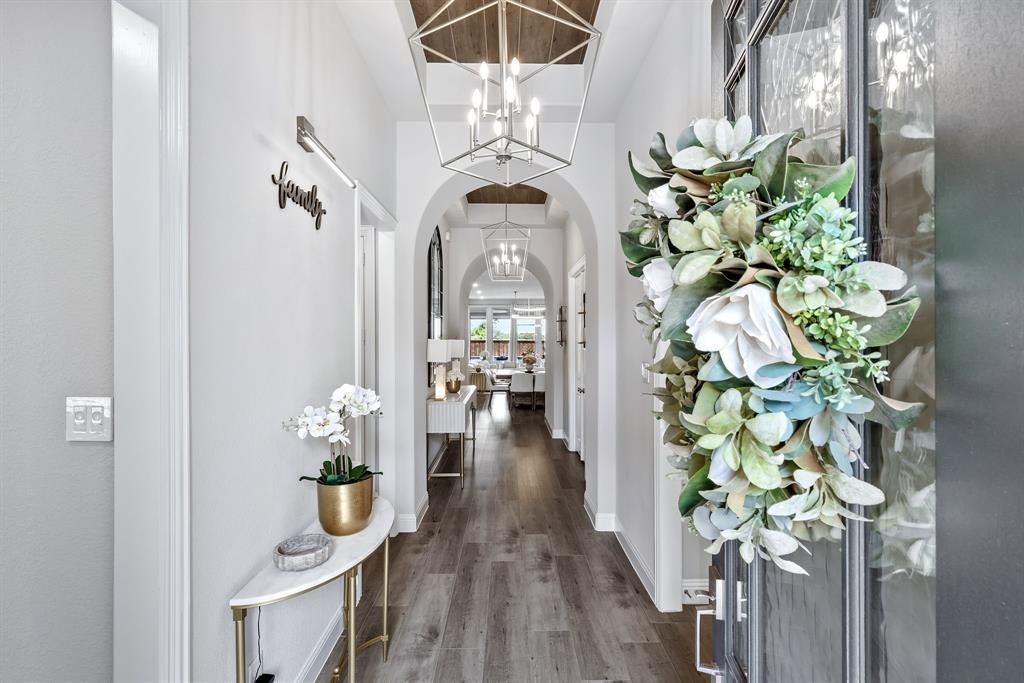 Immaculate, single-story Highland Home in the Barrington Addition of Lantana, offering 3,051 SF of thoughtfully designed living with 4 ensuite beds, 4.1 baths, a private office, media room, & a 2nd workspace just off the primary suite. Meticulously maintained by its original owner, this home showcases over $300K in upgrades & truly shines from the moment you step inside. Wide plank LVP flooring flows throughout the main living areas & bedrooms, complemented by elevated finishes & an abundance of natural light. Plantation shutters frame the front & side windows, while electric blackout shades add comfort to the serene primary retreat. The open-concept kitchen, dining & family room create an ideal space for everyday living & entertaining, complete with surround sound & a stunning fireplace anchoring a wall of windows. The chef’s kitchen features quartz countertops, a large island, breakfast bar, 5-burner gas cooktop, butler’s pantry with wine storage & custom lighting above & below the cabinetry. The private primary suite overlooks the backyard oasis & includes a spa-like bath, expansive WI closet, & a built-in workspace just outside the suite. Step outside to your resort-style backyard—backing to peaceful pasture land—featuring a heated saltwater pool with tanning ledge & waterfall, low-maintenance turf & a spectacular covered patio with cathedral ceiling. The outdoor living area is fully equipped with an electric fireplace, kitchen (including a sink with hot & cold water), automatic screens, built-in heaters & integrated speakers. Additional highlights include a 3.5-car tandem garage with epoxy floors, mini-split HVAC, TV mount, extensive storage. Located on an interior cul-de-sac lot & served by top-rated schools, residents also enjoy Lantana’s exceptional amenities including golf, pools, parks, trails, & fitness centers. Truly move-in ready & designed to impress—this is a must-see home that exceeds expectations at every turn.