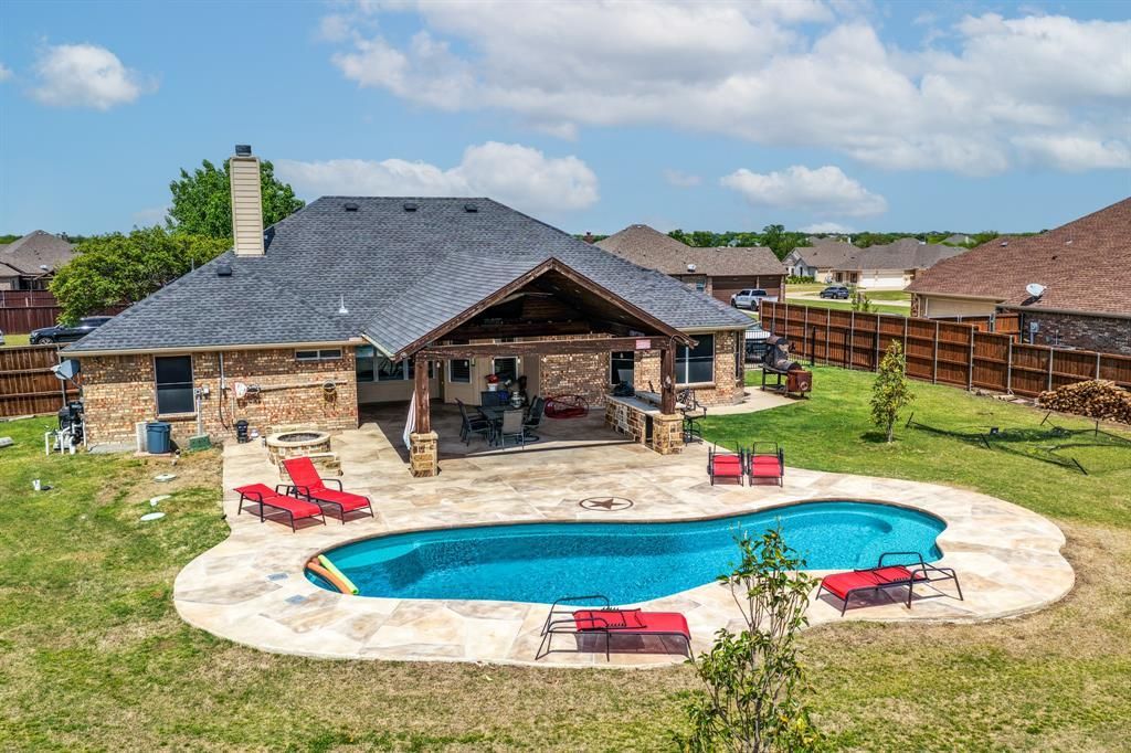 Welcome to your private slice of Texas living in High Meadow Estates! Nestled on just over an acre, this beautifully maintained single-story home offers the perfect blend of comfort, space, and outdoor entertaining. Inside, you’ll find a thoughtfully designed layout featuring 4 spacious bedrooms, 3 full baths, a dedicated office, and inviting living areas centered around a cozy stone fireplace. The kitchen is well-appointed with granite countertops, abundant cabinetry, and a functional layout ideal for everyday living and hosting alike. A standout feature is the impressive 12x10 butler’s pantry, complete with butcher block counters—perfect for prep space, storage, or creating your dream coffee or serving station. Step outside to your own backyard retreat where a Texas-sized covered patio sets the stage for unforgettable gatherings. Enjoy evenings around the fire pit, entertain with ease at the built-in BBQ with bar seating, or relax by the private in-ground pool—all surrounded by wide open space and peaceful surroundings. With no HOA, a 2-car garage, and room to spread out, this property delivers the lifestyle you’ve been looking for with the charm of country living and the convenience of nearby amenities.