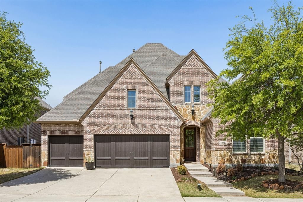 A striking blend of timeless architecture and modern livability, this beautifully appointed home welcomes you with exceptional curb appeal, featuring a classic brick and stone façade, manicured landscaping, and a spacious 3-car garage. Step inside to discover rich hardwood flooring, soaring ceilings, and an open, light-filled layout designed for both everyday comfort and elegant entertaining. The inviting formal dining space is perfectly positioned at the front of the home, framed by large windows and designer lighting, creating an ideal setting for hosting. At the heart of the home, the gourmet kitchen impresses with an oversized quartz island, sleek stainless steel appliances, double ovens, custom cabinetry, and a statement vent hood—all opening to a spacious family room. This space is anchored by a stunning fireplace and enhanced by dramatic ceiling heights and walls of windows, flooding the home with natural light. The private primary suite serves as a serene retreat, featuring a tray ceiling and a spa-inspired bath complete with dual vanities, a soaking tub, and a separate walk-in shower. A sophisticated and versatile home office offers the perfect balance of productivity and comfort. Main floor guest bed. The spacious game room offers a bright and inviting secondary living area, ideal for relaxing or entertaining. With ample room for a lounge setup, play area, this flexible space adapts to any lifestyle. Elevate your entertainment experience in your dedicated media room. The expansive covered patio is designed for year-round enjoyment, featuring a built-in outdoor kitchen with grill, a cozy fireplace, and multiple seating areas—all overlooking a beautifully maintained yard with peaceful greenbelt views and no immediate rear neighbors. Whether hosting guests or enjoying quiet evenings, this outdoor space delivers the ultimate in Texas living.