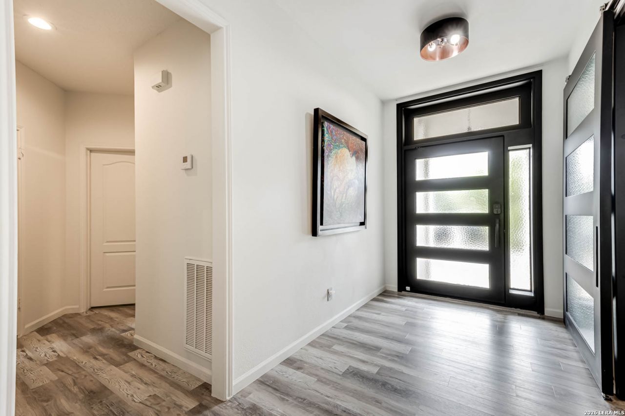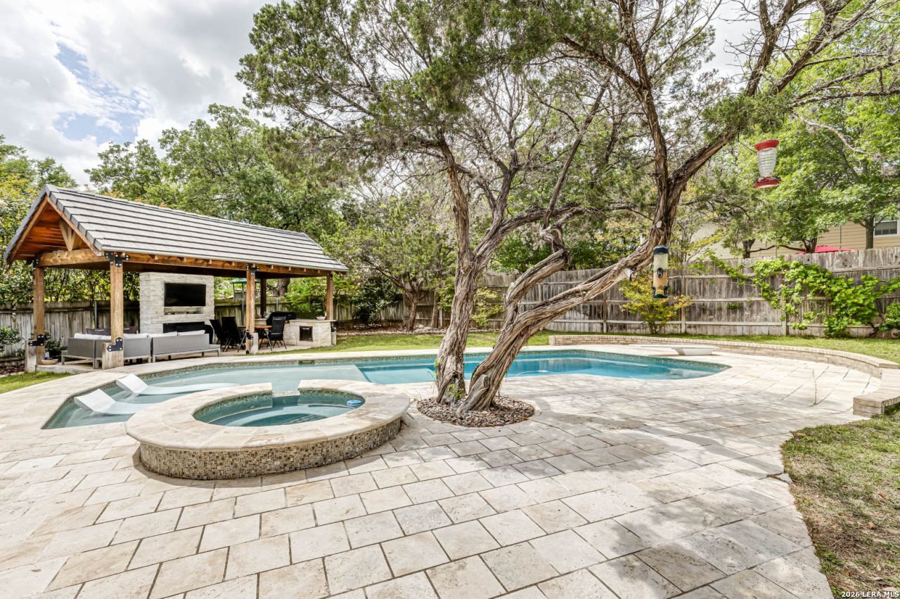 Serenity awaits in this exquisite one-story sanctuary, nestled within the exclusive & desirable guarded "Mission Ridge" Community in one of San Antonios most convenient location, this Home offers 4 spacious bedrooms, 3 luxurious bathrooms - recently transformed with precision, elegance and modern touches, gleaming luxury laminated floors, a sophisticated kitchen, with custom cabinetry, solid countertops, new light fixtures Crisp new exterior doors and expansive windows and doors invite abundant natural light and serene views of the Resort -like -backyard which is an enchanting and relaxing retreat, complete with a sparkling pool and spa, travertine porch, and an elegant gazebo - complete with custom grill and fireplace - perfect for al fresco gatherings beneath starlit skies. Elevated window treatments and impeccable finishes throughout. A true masterpiece!