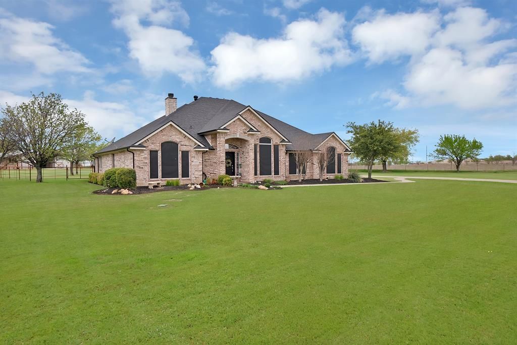 Welcome home to this stunning 5 bedroom, 3 bath custom brick home on nearly 3 acres in the gated Chisholm Trail Estates community. Step inside to an open floor plan filled with natural light, luxury vinyl plank flooring, and a striking floor to ceiling Austin stone fireplace anchoring the oversized living room. The fully renovated kitchen features quartz countertops, subway tile backsplash with decorative tile accent, center island, breakfast bar seating, and modern stainless steel appliances. The split primary suite offers a bay window wall, vaulted ceilings, dual vanities with a seated makeup area, soaking tub, and separate glass-enclosed shower. Four additional bedrooms include a dedicated office with built-in shelving. A formal dining room with vaulted ceilings and arched windows completes the interior. Outside is where this property truly shines. A massive covered patio with reclaimed wood ceiling and string lights creates the perfect entertaining space. The 3 stall livestock barn includes water, electric, a tack room, and multiple turnout pens with pipe fencing. A separate workshop features AC, electric, roll up door, lean-to cover, and concrete pad, as well as a fully functional RV hookup. Updated roof on all structures! This property is an equestrian dream, delivering country living with city convenience, just minutes from shopping, dining, and major highways.