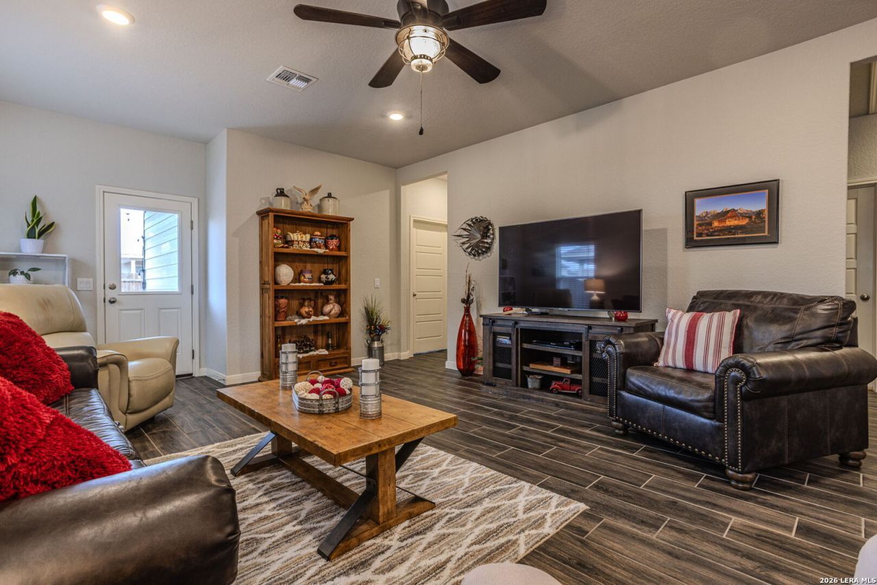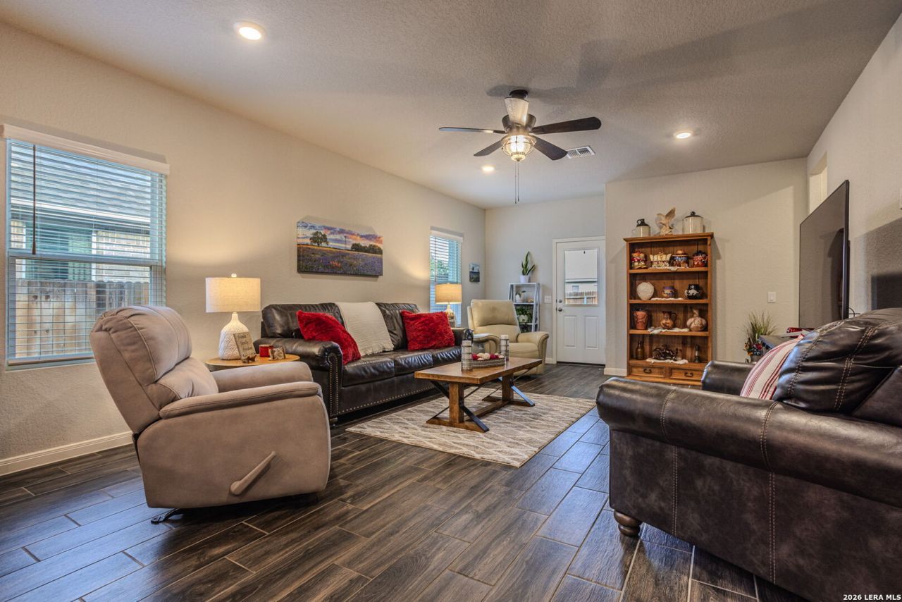 SITUATED IN THE PICTURESQUE AUGUST FIELDS NEIGHBORHOOD, CONVENIENTLY LOCATED OFF FM 1101, NEAR CREEKSIDE, IN CLOSE PROXIMITY TO CANYON MIDDLE SCHOOL, THIS METICULOUSLY MAINTAINED RESIDENCE OFFERS A SPACIOUS LAYOUT FEATURING 3 BEDROOMS, 2 FULL BATHS, OPEN LIVING AREA AND A GOURMET KITCHEN EQUIPPED WITH GRANITE COUNTERTOPS, A BREAKFAST BAR, GAS COOKING, STAINLESS STEEL APPLIANCES, AMPLE PANTRY SPACE , SEPARATE DINING ROOM, AND INSIDE UTILITY ROOM! THE INTERIOR DESIGN SHOWCASES NEUTRAL DESIGNER CHOICES OF SOFT GRAY TONES, AND SLEEK TILE FLOORING THROUGHOUT THE MAIN LIVING AREAS AND BATHROOMS, COMPLEMENTED BY PLUSH CARPETING IN THE BEDROOMS. NOTABLE UPDATES TO THE PROPERTY INCLUDE CEILING FANS, 2" WINDOW BLINDS, PENDANT LIGHTING ABOVE THE BREAKFAST BAR, A GARAGE DOOR OPENER, AND A COMMERCIAL-GRADE WATER SOFTENER. THE HOME ALSO FEATURES A QUICK CUT OFF TO WATER, CONVENIENTLY LOCATED IN THE GARAGE. THE EXTERIOR OF THE PROPERTY FEATURES A COMBINATION OF THREE SIDES BRICK AND CEMENT FIBER SIDING. RESIDENTS CAN UNWIND ON THE COVERED PATIO AND ENJOY THE BEAUTIFULLY LANDSCAPED YARD, COMPLETE WITH A SPRINKLER SYSTEM. AS PART OF THE AUGUST FIELDS COMMUNITY, HOMEOWNERS HAVE ACCESS TO A RANGE OF AMENITIES, INCLUDING A PICKLE BALL COURT, SPORT COURT, DOG PARK AND PLAYGROUND. THE NEIGHBORHOODS PRIME LOCATION OFFERS CONVENIENT ACCESS TO LOCAL SCHOOLS, SHOPPING, DINING, THE RIVER, THE CHARMING TOWN OF GRUENE, AND EASY ACCESS TO IH 35, MAKING IT AN IDEAL CHOICE FOR THOSE SEEKING A QUICK COMMUTE TO RAFB, SAN ANTONIO, SAN MARCOS AND AUSTIN!