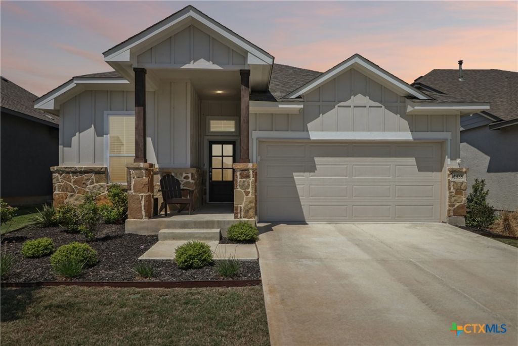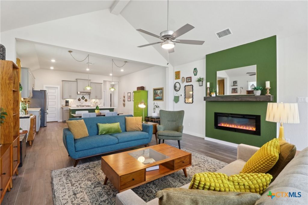 Welcome to 1935 Scarecrow in the desirable August Fields community of New Braunfels, where thoughtful design, quality construction by Chesmar Homes, and curated upgrades create a home that truly stands out. This beautifully maintained 3-bedroom, 2-bath home with a versatile flex space offers the perfect balance of style and functionality with subtle mid-century modern touches and clear pride of ownership throughout. Step inside to soaring ceilings, abundant natural light, and an inviting open layout centered around a cozy electric fireplace. The kitchen delivers both style and function with a gas range, upgraded vent hood, and a ventilated pantry designed to keep small appliances organized and countertops clutter-free. Large windows bring in great natural light, while the flex room provides endless possibilities as a home office, playroom, or second living area. A uniquely designed secondary bedroom offers designer character rarely found in this price range. The primary suite feels like a retreat with a spa-inspired bathroom featuring custom tile work, a spacious walk-in shower, and a generous closet. The backyard was intentionally designed for enjoyment and privacy with a pergola seating area, updated fencing, iron accents, crushed granite, and established landscaping?creating a peaceful outdoor extension of the home. August Fields offers convenient access to shopping, dining, and everyday necessities while maintaining a quiet neighborhood feel. Select furnishings may also be available for purchase. If you've been searching for a home with character, intentional upgrades, natural light, and inviting indoor-outdoor living, this one deserves a spot on your showing list.
