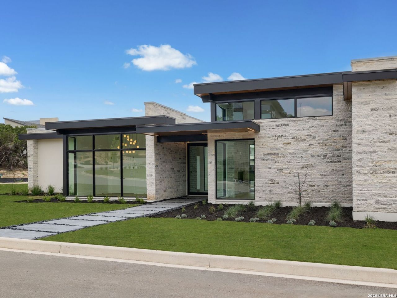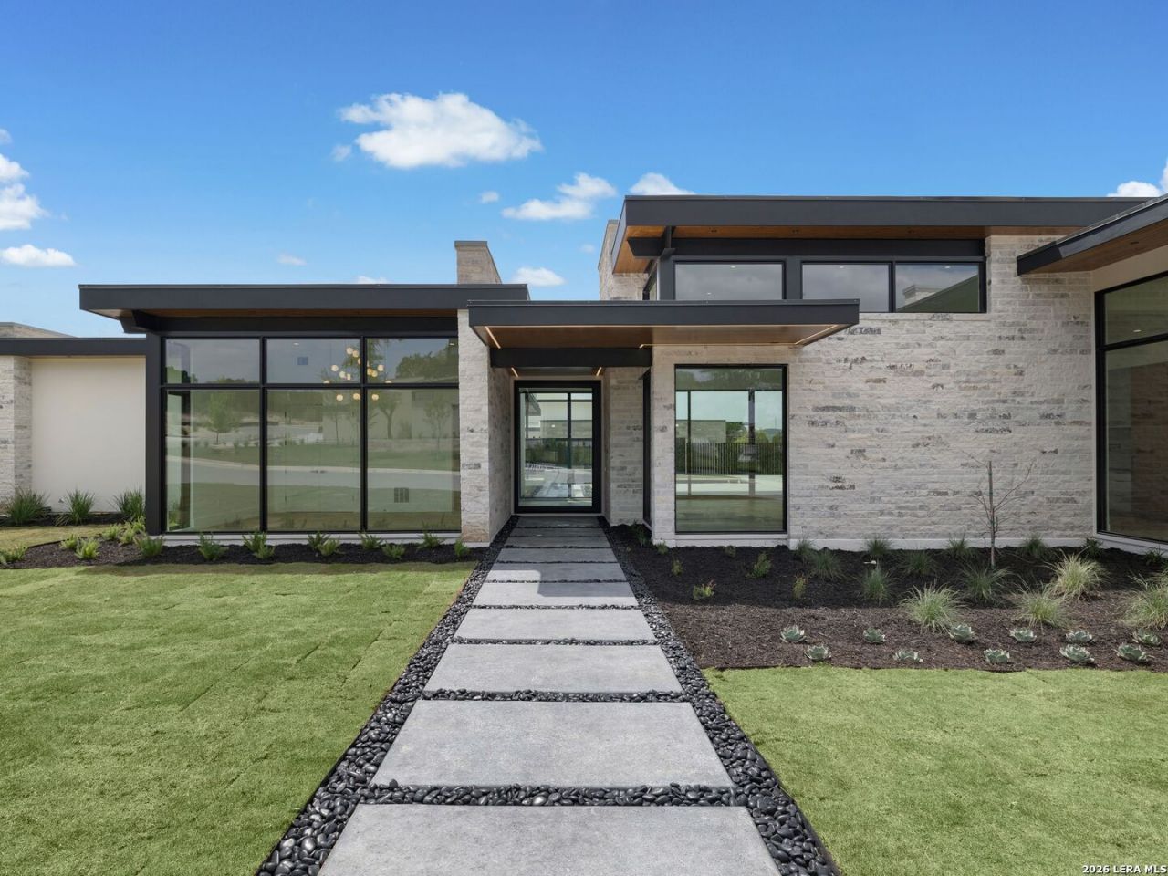 New construction by G Core Construction and designed by JMS Architects, this modern single-story residence in The Dominion is defined by clean architectural lines, a refined material palette, and a layout built to support both everyday living and large-scale entertaining. Positioned on an oversized corner lot, the home was designed to create a natural relationship between the interior and exterior living spaces, allowing each room to feel connected without sacrificing definition or privacy. The main living area is anchored by a floor-to-ceiling stacked brick fireplace and opens directly to the covered patio, creating a seamless transition to the outdoor living areas. White oak flooring, soft finished walls, designer lighting, and custom Michael Edwards cabinetry carry throughout, giving the home a consistent and highly tailored finish. Expansive openings and strong natural light further reinforce the clean, modern character of the interiors. At the center of the home, the kitchen functions as both a true working space and a central gathering point, appointed with a waterfall island, extended bar seating, an open concept pantry with additional prep space and display shelving, and a premium appliance package. A nearby wet bar and oversized game room continue that same approach, creating a secondary entertaining space that opens naturally to the patio and pool. Privately positioned, the primary suite opens to its own patio and is paired with a bath featuring floating vanities, a garden tub, a seamless glass walk-in shower, and a custom-designed closet. A dedicated study, flex space, and well-appointed secondary bedroom suites add depth and flexibility to the floor plan, while outside, architectural beam detailing, a full outdoor kitchen, pool, and spa, mature oaks, and a side entry three-car garage complete the setting with the same attention to finish and livability found throughout the home.