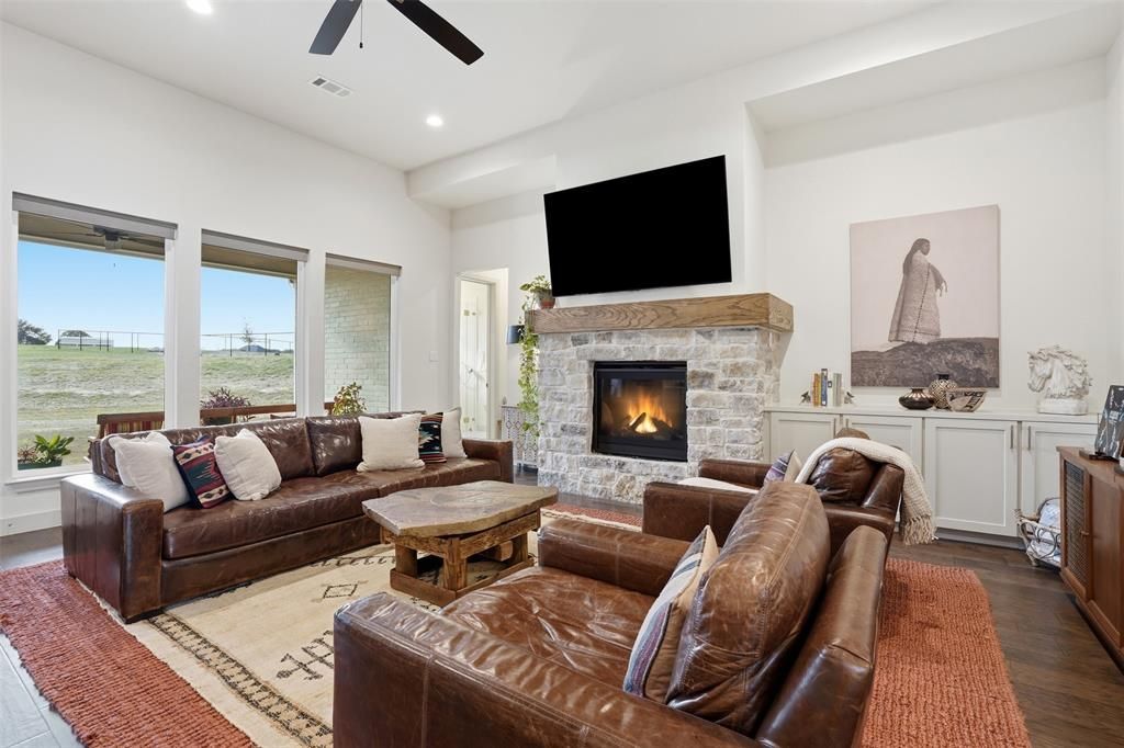 Set on just over 2 peaceful acres between Weatherford and Granbury, this beautifully designed 2023 modern farmhouse offers space, style, and flexibility for country living. The open concept layout seamlessly connects the living, dining, and kitchen areas, perfect for both everyday living and entertaining, while a dedicated office provides a quiet work-from-home option. A cozy fireplace anchors the living room, and the spacious primary suite features a soaking tub, separate shower, and generous walk-in closet. Upstairs, the fifth bedroom with a full bath could also serve as a game room or media room. Outside, enjoy wide open skies, visiting deer, and room to add a pool. A standout feature is the impressive 40x40 insulated and air-conditioned workshop with a premium modern garage door, bathroom, RV hookups, and patio, an ideal space for hobbies, projects, or equipment. With no HOA, horse-friendly acreage, and the Brazos River boat ramp just minutes away, this property offers the perfect blend of privacy, functionality, and country charm.