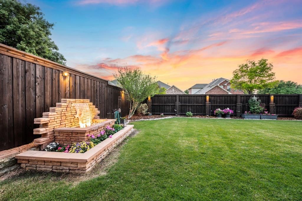 Welcome to this beautifully maintained single-story home situated on a large corner lot in the desirable Meridian Addition, ideally located with easy access to major highways and just minutes from Lake Lewisville. Offering 3 bedrooms and 2 bathrooms, this home combines comfort, functionality, and an inviting outdoor lifestyle. Step outside to a thoughtfully designed outdoor living area featuring a built-in grill, two-burner stovetop, and ample storage, perfect for entertaining or relaxing evenings at home. The backyard also includes a raised garden area and a storage shed with electricity, providing both charm and practicality. A tranquil fountain with evening lighting creates a peaceful retreat, while built-in landscape lighting with customizable colors adds a unique ambiance after sunset. A rare opportunity to enjoy indoor comfort and outdoor living all in one.