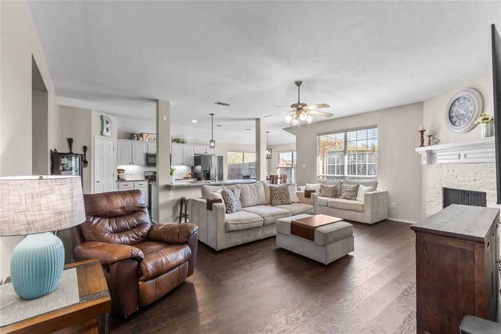 Beautifully updated one-story home in sought-after Lofland Farms on a spacious corner lot. This move-in ready home features updated flooring, modern light fixtures, and a stunning remodeled kitchen open to a large family room with a stacked stone fireplace, gas logs, and gas starter. Flexible floorplan includes a formal dining room with glass French doors that also works well as a home office or playroom, plus a breakfast bar for casual dining and entertaining. Private primary suite offers separate sinks, garden tub, separate shower, and oversized walk-in closet. Recent updates include water heater replaced in January 2026 and disposal replaced in 2024. Neighborhood HOA includes community pool and park. Great Rockwall location with comfort, function, and style all in one.
