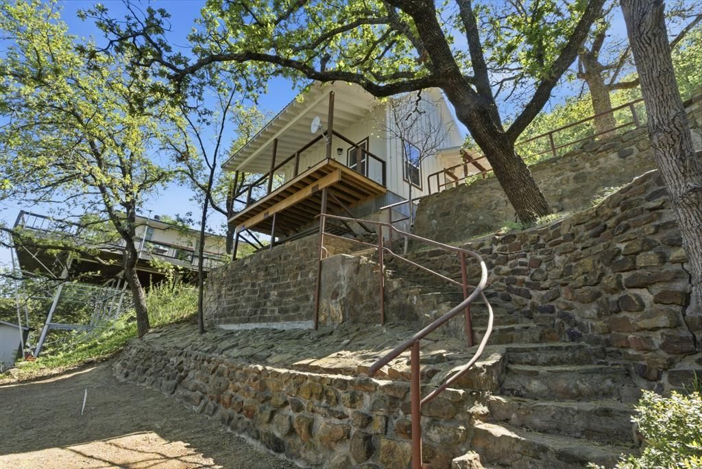 Just in Time to Kickoff Lake Season, this Newly Constructed Lake House was built in 2024 and is ready for it's next family to move in and enjoy this hidden gem on Lake Palo Pinto located a few minutes North of Santo and Gordon and barely over and hour West of Ft Worth. This 1.5 story 2 bedroom 1 bath is very well constructed and nicely finished out with custom cabinets, granite counter tops, luxury vinyl plank flooring, fully tiled walk-in shower and a vaulted ceiling. The home also offers a Great View of the Lake from a 20x7 trex deck to enjoy watching sunrises and sunsets and your kids and grandkids enjoy Lake Life. The property also features native rock retaining walls and spiral steps leading to a mid-level covered patio area with a built-in barbeque grill and a picnic table. Also on the same level is a 16x8 climate controlled portable building with water and electricity that is used for dining and gaming. From there the rock steps lead down to lake level with two separate walkways leading to two docks. One is a swimming-diving dock, equipped with diving board and ladder and the other is a completely enclosed floating fishing dock that also has electricity, water, refrigerator, fish cleaning sink, heat and air conditioning. Built for year round fishing this dock was constructed with Full Time Anglers in mind. This one is Priced Right so be sure to Call today for a showing!!!