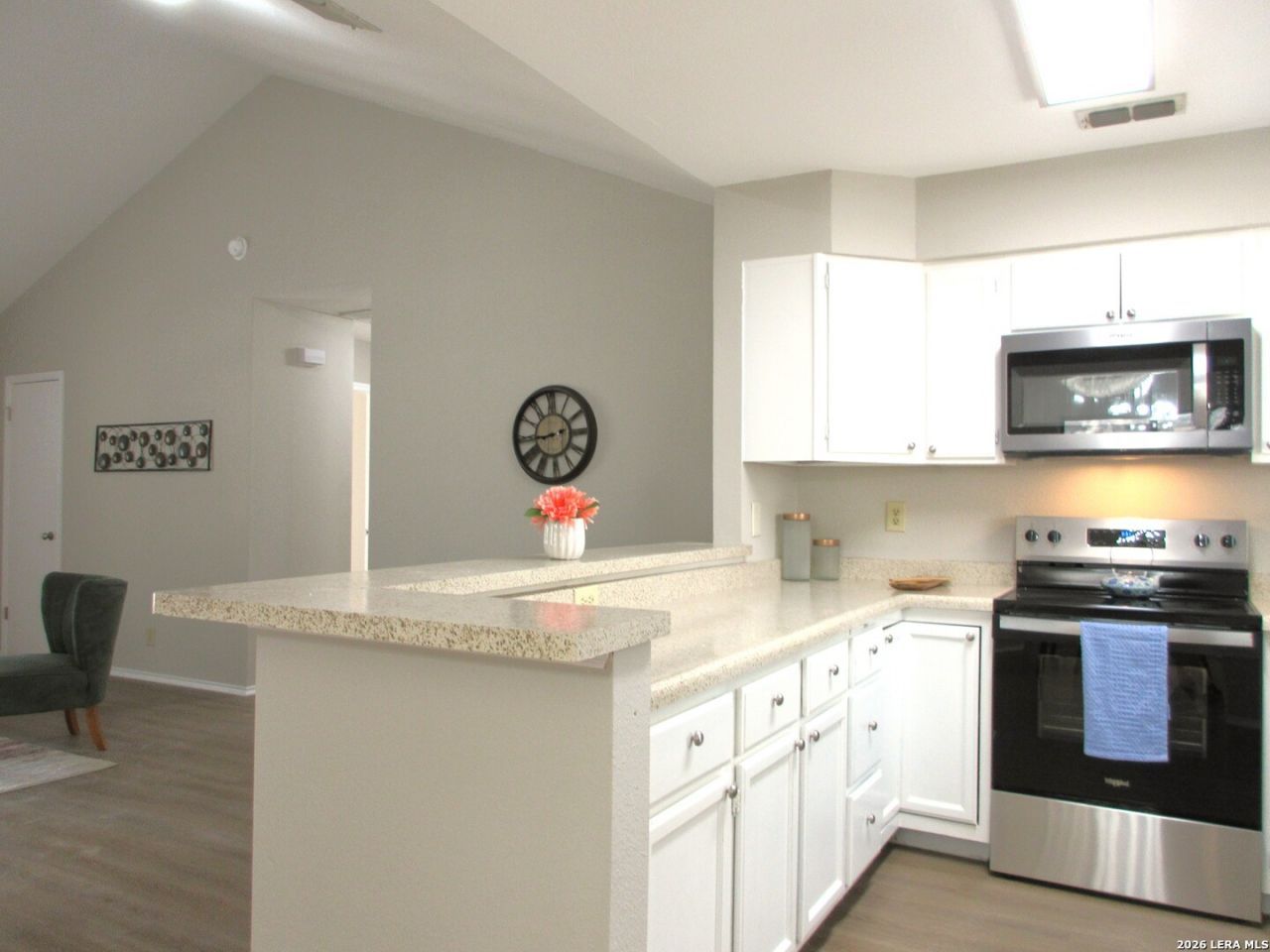 Completely updated and beautiful. Kitchen features new stainless appliances and a breakfast bar. New light fixtures. New door and cabinet hardware. New faux wood flooring in the living area, dining, and kitchen. New carpet in the bedrooms. High ceilings. Fresh paint inside and out. New 2 inch blinds and window treatments are included. Covered patio. New AC and heat system 2026.