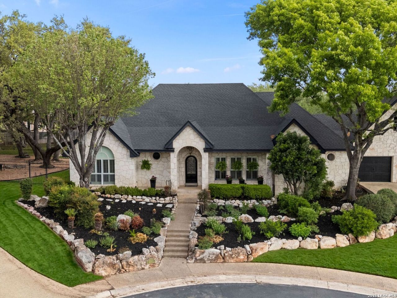 Set on an oversized cul-de-sac lot within the guard-gated Emerald Forest community, this thoughtfully updated single-story offers privacy, functionality, and elegance. A covered front porch provides a welcoming entry with majestic views. Inside, beautifully upgraded elements accent the home. The designer kitchen anchors the main living spaces and opens to breakfast area and family room, where high ceilings, natural light, and a fireplace create a warm, inviting atmosphere. Formal living and dining provide space for all. Plantation shutters are installed throughout. The primary suite offers outdoor access to backyard offering a quiet retreat. Secondary room connected to the primary and complete with a spacious closet-provides flexibility for a 3rd bedroom, private office, exercise, or flex room. A well-sized laundry room offers additional storage with extensive cabinetry, sink, and space for additional refrigeration. Outdoor living is equally considered, with a covered patio and an expansive flagstone terrace featuring a built-in fireplace, ideal for both entertaining and everyday enjoyment. Mature and lush landscaping and a fully fenced yard enhance the property and contributes to a quiet, established feel. The home is a true single story with no interior steps and subtle accessibility features in place. Emerald Forest is one of North San Antonios most established gated communities, with wonderful amenities such as pool, tennis, walking trails, all with guarded access and entry from both Bulverde Road and Loop 1604.