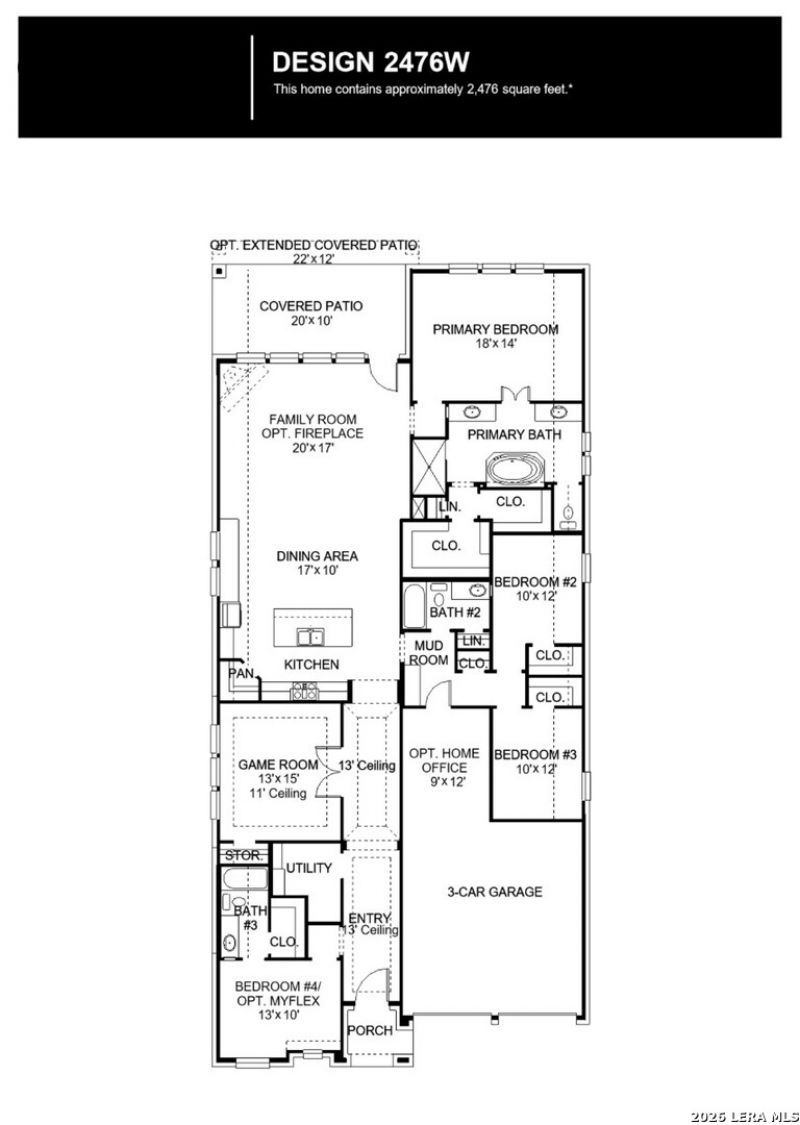 Extended entry with 13-foot ceiling leads to open kitchen, dining area and family room. Kitchen offers generous counter space, corner walk-in pantry, a 5-burner gas cooktop, and island with built-in seating space. Dining area flows into family room with wall of windows. Game room with French doors. Primary suite includes double-door entry to primary bath with dual vanities, freestanding tub, separate glass-enclosed shower and two walk-in closets. Secondary bedrooms feature walk-in closets. Extended covered backyard patio. Mud room off three-car garage. Landscape features a 6-zone sprinkler system.