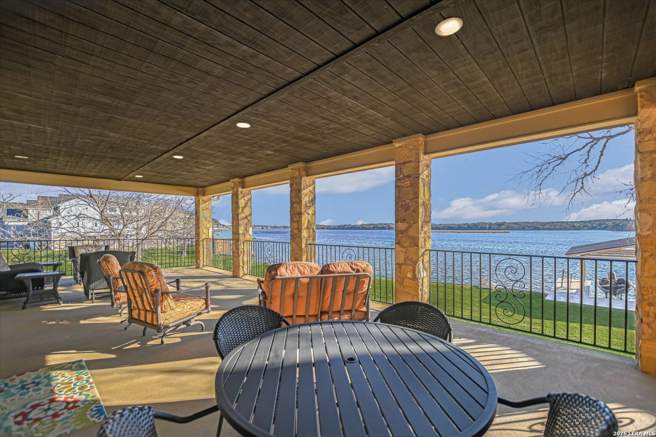 Positioned on two Lake LBJ waterfront lots, 360 Campa Pajama offers 140 of shoreline and sweeping southwest-facing views across the main body of the lake. Built in 2018 with 3-bedrooms, 3.5-baths, plus a dedicated study, the 3,295 sq. ft. home blends comfortable lake living with exceptional indoor & outdoor entertaining spaces. The open-concept living area features soaring ceilings and a wood-burning fireplace, with expansive windows that frame the lake views and fill the space with natural light. The kitchen is anchored by a large center island and offers a convenient butlers pantry for prep and storage space, and a Bosch appliance package including a gas cooktop. Each bedroom features its own ensuite bath, while the study offers a built-in Murphy bed, providing flexible guest accommodations. The spacious primary suite offers a spa-like bath with double vanity, soaking tub, walk-in shower, and generous closet space. The homes appeal extends to its outdoor living areas. A covered patio off the main living area provides front-row seats to Hill Country sunsets, while the lower level offers extensive covered outdoor living and storage space including an outdoor kitchen, wood-burning fireplace, powder bath, outdoor shower, and flex room with mini split. A lush, flat lawn extends from the home to the waters edge, creating an easy connection to the covered two-stall boat dock and a unique diving board. A gated entry and detached storage building provide secure space for boats, lake toys, and equipment.
