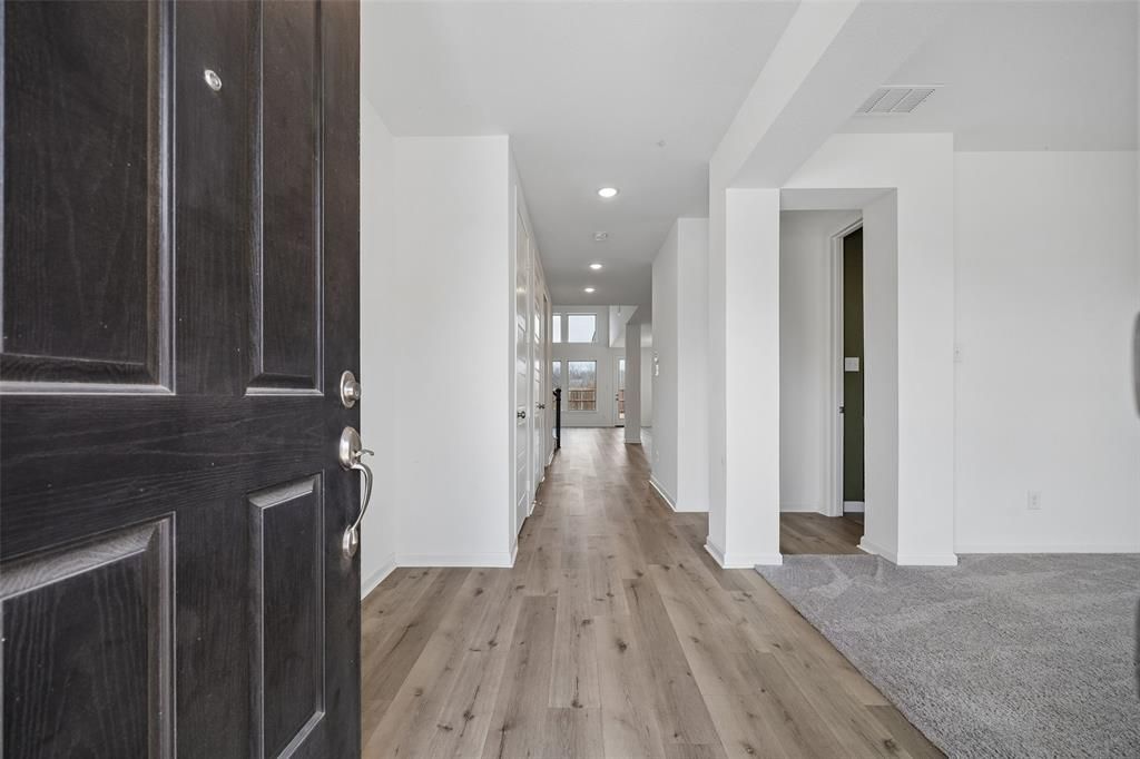 ASSUMABLE 3.75% LOAN! Beautiful two-story home with modern finishes and a rare backyard setting that backs to a peaceful wooded lot. Located in a desirable community near Lake Lewisville with resort-style amenities, this home offers both privacy and convenience. Inside, the open-concept floor plan is dressed in today's designer finishes and features wide plank flooring, abundant natural light, and a spacious living area with soaring ceilings and a modern fireplace that creates a warm focal point. The kitchen is designed for everyday living and entertaining with granite countertops, stainless steel appliances, a gas cooktop, refrigerator, large center island, and generous cabinet space. The dining and living areas flow seamlessly together, creating a bright and functional space ideal for gatherings. Large windows along the back of the home provide views of the backyard and wooded area beyond, adding a sense of privacy not often found in neighborhood homes. The primary suite includes a large walk-in closet and a modern bathroom with dual sinks and an oversized glass shower. Additional bedrooms and flexible living space upstairs provide room for family, guests, or a home office. The backyard is a standout feature, offering approximately 10-15 feet more depth than many neighboring lots, creating extra room for gardening, pool, or play. The covered patio provides a comfortable place to relax while enjoying the natural setting behind the home. Residents enjoy access to community amenities including a pool, playground, and scenic hike and bike trails, making it easy to enjoy the outdoors close to home. Great location with easy access to shopping, dining, entertainment and all that Frisco has to offer.