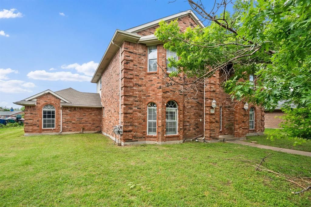 Welcome to this spacious 4-bedroom, 2.5-bath two-story brick home in Rowlett featuring impressive curb appeal with mature shade trees and a stately front elevation. Inside, the expansive floor plan offers multiple living and dining spaces designed for comfortable living and entertaining. The oversized family room showcases wood-like flooring, a striking brick fireplace with custom wood mantel, built-in accent wall, plantation shutters, and seamless flow to the kitchen and formal dining room. The kitchen features sleek countertops, extensive wood cabinetry, tile flooring, center island, and pantry. Upstairs, the expansive primary suite offers vaulted ceilings, a bright sitting area with bay-style windows, and abundant space. The ensuite bath includes dual vanities, a soaking tub, separate shower, private water closet, and large walk-in closet. Three additional spacious bedrooms and two full baths provide flexibility for family, guests, or office space. Conveniently located near shopping, dining, parks, I-30, and Hwy 66.