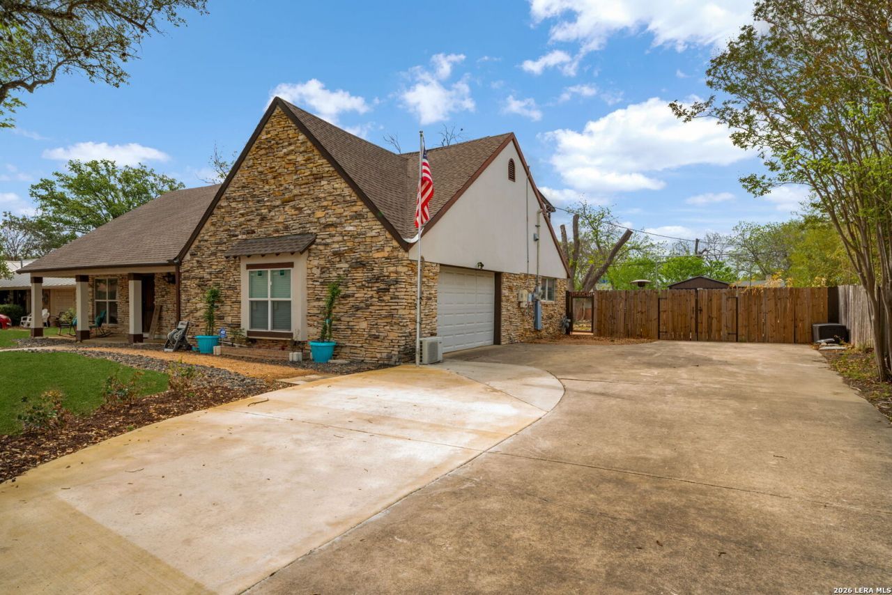 Welcome to 450 Spaceway Drive, a truly stylish two-story home nestled in one of San Antonios most cherished communities, Windcrest. Situated on a spacious 0.27-acre lot, this property is surrounded by mature trees and lush landscaping, offering exceptional privacy, space, and a distinctive architectural style that sets it apart. This thoughtfully designed 4-bedroom, 3.5-bath home features dual primary suites and tasteful updates throughout. From the moment you arrive, youll appreciate the enchanting curb appeal, highlighted by four sides masonry construction and a welcoming covered front porch. Inside, the bright and open floor plan is complemented by ceramic wood-look tile flooring throughout the main living areas. The spacious living room flows seamlessly into the chefs kitchen, complete with gas cooking, granite countertops, stainless steel appliances, and striking cedar beam ceiling accents that add warmth and character. The downstairs primary suite is privately situated and offers a full ensuite bath with dual vanities and a large walk-in shower. Upstairs, youll find generously sized secondary bedrooms along with a second primary suite featuring its own expansive ensuite with dual vanities and an oversized walk-in shower. Step outside to enjoy the homes extended covered patio, providing ample space for entertaining or relaxing outdoors. The unique alley access to the backyard allows for convenient RV or trailer parking, adding to the homes versatility. This property offers a rare combination of lot size, character, and flexibility within an established community. Enjoy close proximity to parks, walking trails, and a golf course, all while experiencing the quiet, welcoming atmosphere that makes Windcrest so desirable. Schedule your private showing today and discover everything this exceptional home has to offer.