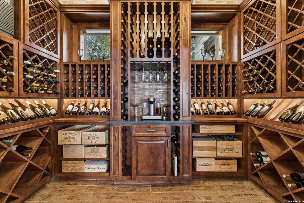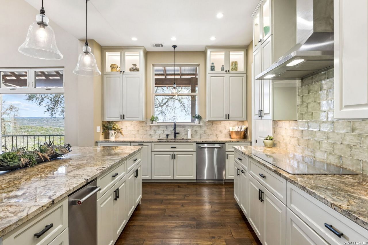 Tucked behind a private gated entrance and positioned deep within approximately 25.5 acres of rolling Hill Country terrain, 5214 Travis Peak Trail offers a rare combination of privacy, breathtaking views, and flexible living with two residences, a main home and guest home (both are 2 beds/2 baths each) on one spectacular property. Perched atop the land, the property captures sweeping panoramic vistas that stretch for miles, delivering unforgettable sunrise and sunset views. The main residence, built by respected custom builder Riata Builders, features timeless Hill Country architecture with a full stone exterior and metal roof designed for durability and character. Inside, the home opens to a dramatic living room highlighted by soaring 24-foot wood beam ceilings, rich engineered wood flooring, and a striking wood-burning fireplace with custom carved detailing and wood mantle. Recessed wall niches on each side of the fireplace create architectural interest while oversized windows frame the surrounding landscape. The dining area sits perfectly between the living room and kitchen beneath elegant chandeliers, creating a welcoming gathering space for entertaining. Just beyond, a temperature-controlled wine room with etched wine-themed flooring offers the perfect place to store and showcase your collection. The kitchen is designed for both function and entertaining, featuring granite countertops, a large granite island with electrical outlets, GE Monogram appliances, recessed lighting, under-cabinet lighting, pull-out storage systems, built-in refrigerator, double-door oven, dishwasher, and ice maker. A spacious walk-in pantry with a secondary refrigerator provides additional storage and convenience. The primary suite offers privacy and direct patio access with beautiful Hill Country views. The primary bathroom includes a large soaking tub, walk-in shower, dual sinks, unique tile work, and a spacious walk-in closet complete with built-in shelving, dressers, and shoe storage. A secondary bedroom with walk-in closet and beautifully tiled bathroom is located just down a short hallway. Outdoor living is a highlight of the property with a full-length covered porch featuring wood beam ceilings and ceiling fans, plus a nearby fire pit gathering area perfect for enjoying quiet Hill Country evenings. Beyond the main home sits a fully independent guest residence, also built by Riata Builders, transforming the property into a true compound. The guest house includes a spacious living and entertainment area with concrete floors, pool table, shuffleboard, and surround sound. The kitchen features a granite island with electrical outlet, dining area, pantry, dishwasher, refrigerator, ice maker, and recessed lighting. Two bedrooms are located in the guest house, including a primary-sized bedroom with walk-in closet and private bath with copper sink and shower. A second bedroom with walk-in closet is served by a hall bath with walk-in shower. A stac