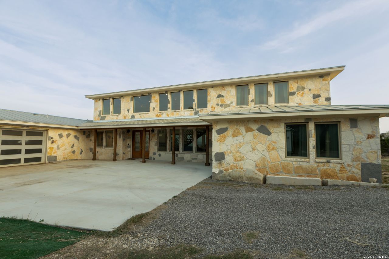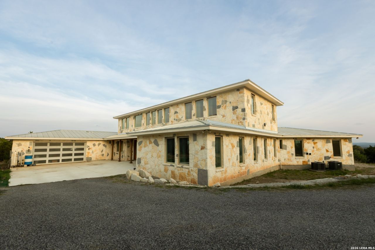 Stunning custom home built in 2023 situated on 14.75 acres in Bandera, offering a perfect blend of modern luxury and Hill Country living. This spacious 4-bedroom, 4-bath home features approximately 3,500 square feet with an open-concept design and soaring 19-foot ceilings in the living area. Large windows throughout provide abundant natural light and showcase breathtaking views and the perfect setting for peaceful wildlife watching right from your own backyard. The chefs kitchen is equipped with high-end appliances including a Sub-Zero refrigerator/freezer, Wolf 6-burner dual-fuel range with double oven, Wolf microwave drawer, Cove dishwasher, and Scotsman ice machine. Additional features include quartzite countertops, a large island, walk-in pantry, and built-in desk area. Copper accents and quality finishes add warmth and character throughout. The home offers generous storage, ceiling fans in all bedrooms and living areas, and a spacious porch ideal for enjoying the surrounding landscape. The primary suite includes a walk-in bathtub, dual toilets, and accessibility features, while the home is partially ADA compliant with a roll-in front entry and two roll-in showers. Additional highlights include a metal roof, private water well with pump house, and a 3,500-gallon storage tank. A rare opportunity to own a thoughtfully designed property with premium features, privacy, and scenic views.