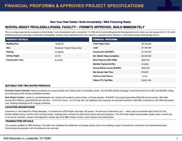 Shovel-Ready 1.04-Acre Indoor Sports Facility Site - Lewisville, TXSkip the 12-18 month entitlement process. All civil and building permits are approved and in hand on this fully permitted, construction-ready parcel just off I-35 in one of DFW's strongest suburban submarkets. Zoned General Business and surrounded by established retail, commercial, and dense residential, this site is entitled for a 16,000 SF indoor sports facility accommodating pickleball, padel, golf, and fitness — saving a buyer significant soft costs and eliminating the single biggest risk in development: entitlement uncertainty.Location Advantage No Competitor Can Replicate - Central Lewisville positions this facility directly adjacent to Lewisville High School (4,162 students), two middle schools, and the LISD Learning Center — a built-in pipeline for youth programming, after-school leagues, and family memberships no competitor is positioned to capture. The average pickleball player is now 35 years old, matching the median age and income profile of surrounding neighborhoods. The opportunity isn't to enter an empty market — it's to own the best-located site in one that's already proven.Site Entitlement Specifications16,000 SF, 25-29 ft clear height, 8-month build timeParking: 32 on-site plus up to 15 additional via adjacent lease at $1.88 per space per monthUtilities: All available — service letters in handFinancial HighlightsPurchase Price: $1,000,000SBA Eligible: approx. $550K down on a $2.75M total projectProforma at Stabilization: $256K approx. annual income, 14.3% approx. cash-on-cash return, $3.65M approx. value at a 7% cap rateOwn and operate or build and lease — all permits, utility letters, and proforma available upon request.