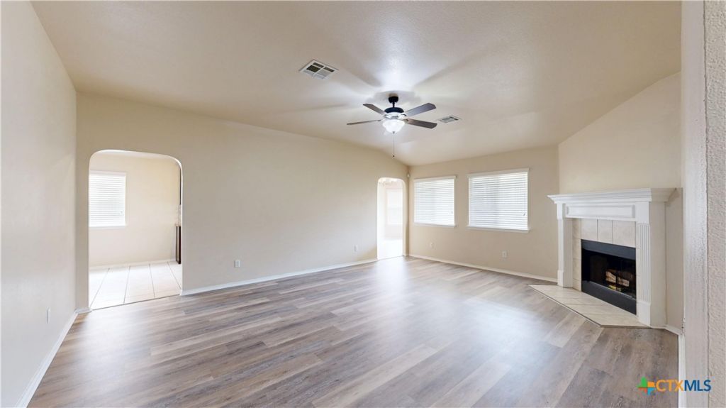 Located minutes from Clear Creek gate of Fort Hood in Killeen, TX, this single-story 4 bedroom, 2 bath, 2 car garage home offers 1889 sq. ft. of living space across four bedrooms and three bathrooms. The layout connects common areas through arched doorways, lending architectural character throughout. The entry opens into a dining room featuring tile flooring, a chandelier, and a bay window configuration with a secondary door providing additional natural light. The living room is highlighted by wood-look laminate flooring, neutral beige walls, and a tile-surround fireplace with a white mantel as a focal point. Two windows with horizontal blinds allow ample natural light. An adjacent open area, also with wood-look flooring and a ceiling fan, connects toward the kitchen and hallway. The kitchen features dark espresso cabinetry, tile backsplash, a double sink, and light tile flooring, with windows positioned above the sink. The bedrooms include luxury plank flooring and ceiling fans; the primary bedroom measures 220 sq. ft. and features a vaulted ceiling with an arched window. The primary bathroom includes a soaking tub with a privacy window. A secondary bathroom offers tile flooring, a tub-shower combo, and dark wood vanity cabinetry consistent with the home's overall design palette. Fully fenced backyard, established landscaping, mature trees complete this gem by Fort Hood.