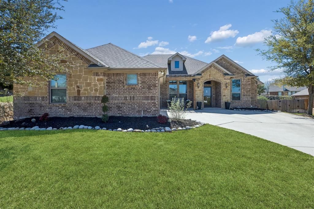 Beautiful newer 3-bedroom, 3-bath home with approximately 2,384 square feet, a heated pool, and exceptional indoor-outdoor living in Fort Worth near Eagle Mountain Lake. Filled with natural light, this home offers no carpet, neutral colors, recessed lighting, gorgeous hardwood flooring, and airy tile throughout. A private office with French doors sits just off the entry, while the open-concept kitchen and living area is designed for both daily living and entertaining. Kitchen features include custom quartz countertops, undermount sinks, stainless steel gas cooktop, double stainless steel gas convection ovens, built-in microwave cabinetry, stainless steel dishwasher, and a newer high-end refrigerator that remains with the home. The living room features a tucked-away corner fireplace that adds warmth and charm. The primary bath includes double vanities, a stand-alone garden tub, and separate tiled shower. Outside, enjoy a front porch sitting area, terraced backyard with stone retaining wall, heated chlorine pool with rock waterfall feature, and an extended covered patio with pergola styling. The outdoor living space is complete with a granite bar top, built-in grill, refrigerator, fully bricked woodburning fireplace, infrared heater, and ceiling fan. Conveniently located near parks, shopping, dining, Fort Worth Meacham International Airport, the Fort Worth Stockyards, and Eagle Mountain-Saginaw ISD.