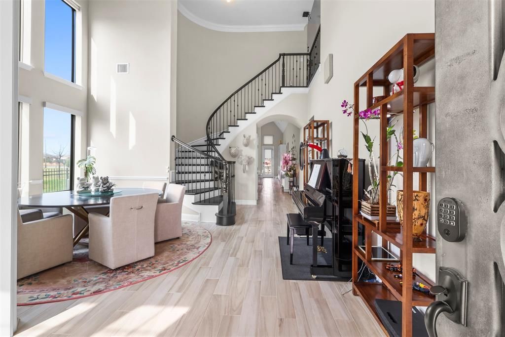Welcome to your dream home — a custom Toll Brothers residence on a premium lakefront lot with peaceful water views. Enter through an elegant iron door into a thoughtfully designed floor plan featuring a main-level family room with fireplace, chef’s kitchen with large island and breakfast nook, formal dining room, large private study, and an oversized primary suite with spa bath and fully customized California Closet. Beautiful wood stairs lead upstairs to a second living area, media room, and two generous secondary bedrooms. The backyard is a true resort retreat with a covered patio, built-in outdoor kitchen, and an oversized patio - all overlooking the lake. Premium upgrades include ShelfGenie pull-outs throughout, California Closets, built-in speakers, custom blue toothed controlled and powered shades, garage epoxy floors and overhead slat storage, solar panels, extensive storage, two EV charging stations in the garage and backyard pre-wired for TV and sound. This rare lake-view home blends designer finishes with exceptional functionality for effortless entertaining and everyday living.