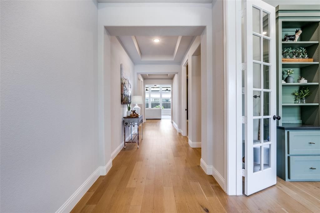 Spacious, well-appointed single-story home in Argyle ISD’s Canyon Falls neighborhood. Thoughtful design delivers an open interior with wide hallways, tray ceilings, and on-trend light wood floors throughout major spaces, creating a seamless flow ideal for everyday living. Off the foyer, a private study with French doors and custom-built-ins offers a dedicated work-from-home space or, with its access to plumbing, makes a great lounge room. The central living area features vertical shiplap above the fireplace and inside built-ins, adding architectural detail and a warm focal point. The adjacent kitchen is appointed with quartz countertops, stainless steel appliances, an apron-front farmhouse sink, five-burner gas cooktop, pot filler, & a large island with a pull-out trash-and-recycling center. It's a perfect gathering space for family and friends. Bedrooms are arranged in a three-way split configuration for privacy and flexibility. The primary suite boasts direct patio access from the bedroom, while the attached bath offers dual sinks, a frameless shower, and a soaking tub beneath a rain-glass window. Two secondary bedrooms share a full bath, while a third has its own ensuite—ideal for guests or multigenerational living. A powder bath is conveniently located near the living & media rooms for easy access when entertaining. The soundproofed media room is great for movie nights, gaming, or as a versatile flex play room. The utility room features extensive storage, with a shiplap wall including coat hooks, cubbies above and below a built-in bench, and space for an additional refrigerator. Outdoors, the extended covered patio includes ceiling fans, a stone-lined planter, & gas connections for a grill or patio heater. Nice closet space throughout + fully floored, standing height attic. Canyon Falls amenities include pools, splash pad, fitness center, dog park, playgrounds, miles of trails. HOA covers front yard care, cable, and internet. Walk to Argyle South Elementary!