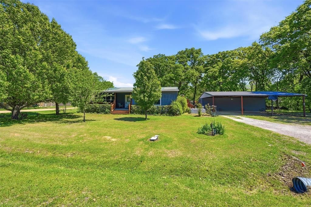 Welcome your family to this 4 bedroom, 2 bath home, featuring porches perfect for outdoor enjoyment. The open kitchen area is ideal for entertaining or accommodating a large family. The master suite is separate from the other 3 bedrooms. HVAC was replaced in 2025, and the electric water heater was replaced in 2021. Dual fans in the living area enhance circulation. Situated on 4 lots, the property extends the entire west side of the block, totaling .71 acres. Aloha Gardens subdivision is adjacent to Corp land, offering hiking, fishing, kayaking, and other outdoor activities. Big Mineral Marina on Lake Texoma is less than a mile away, providing a boat ramp and amenities for outdoor enthusiasts. This beautiful, treed lot offers space for outdoor toys and family gatherings. It makes a great lake home or permanent residence. The 3-stall carport and large driveway provide ample parking and storage. Two separate storage areas are attached to the carport and include electrical, shelving, and ample storage.
