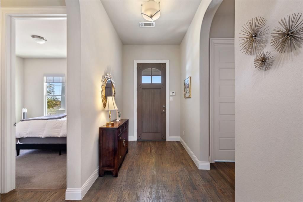 Stunning modern Craftsman-style home offering country-like tranquility with wide-open spaces, trails, and creeks right across the street. Enjoy panoramic sunsets from the covered front porch or cast a line in the bass-stocked pond just 150 ft away. Inside, the open floor plan showcases soaring ceilings, nailed-down hand-scraped hardwood floors, and abundant natural light with custom window coverings. The chef’s kitchen features a huge island with seating, walk-in pantry, gas cooktop, built-in oven and microwave—all overlooking the spacious living area with a stone fireplace and adjoining dining room, perfect for entertaining. The primary suite offers a cozy retreat with a walk-in shower, double vanity, enclosed water closet, and a show-stopping closet connected to the utility room. Secondary bedrooms are generously sized with ample storage. Out back, enjoy the covered patio with gas hookup, lush landscaping, and one of the largest yards on the block. The community offers a friendly small-town feel with parks, greenbelts, an Olympic-sized pool, and a dog park—all with easy access to Hwy 190 and I-30.
