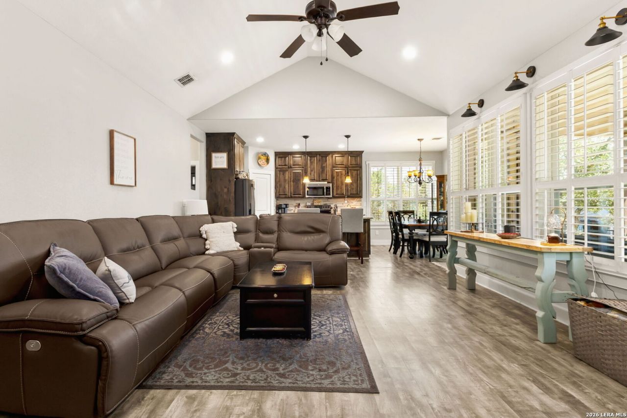 Welcome to this beautifully maintained 3 bedroom, 2 bath home in the desirable Cypress Cove community of Spring Branch, situated on an oversized lot with exceptional outdoor features and thoughtful upgrades throughout. Inside, youll find an open-concept layout filled with natural light from abundant windows, enhanced by plantation shutters and remote-controlled accent lighting. The spacious living area is anchored by a stunning floor-to-ceiling wood-burning fireplace, creating a warm and inviting focal point. The kitchen features stainless steel appliances, granite countertops throughout the home, and a functional layout perfect for everyday living and entertaining. The split-bedroom floor plan offers added privacy, and with no carpet anywhere in the home, maintenance is simple and stylish. Step outside to a beautifully landscaped backyard shaded by mature trees and designed for relaxation and social gatherings. Enjoy the covered back patio, a separate paved paver sitting area, and a wrought-iron fenced yard that adds both charm and function. The property also includes a storage shed with its own private driveway and gated access, plus an additional workshop reached by a decorative paved gravel road-ideal for hobbies, projects, or extra storage. Additional highlights include solar panels to help reduce electricity costs, gutters, a reverse osmosis drinking water system and water softener. The home offers easy access to HWY 281 and is in close proximity to Canyon Lake. The neighborhood boasts direct access to the river and lake, featuring boat ramp 11, and a private river park for water enthusiasts. Residents can also enjoy community amenities such as a pool, sports courts, and more, making this an ideal place to call home. Situated in a prime location, indulge in a picturesque journey, exploring quaint neighboring towns, and embarking on some sightseeing or treasure hunting in antique shops. Discover the charm of local wineries nearby, hike along the Canyon Lake Dam or through the breathtaking Gorge, or paddle your way through the Guadalupe River. As night falls, immerse yourself in the rhythm of the outdoors at a captivating concert held at the Whitewater Amphitheater. Whatever your passions may be, this home caters to a wide range of interests. With convenient access to San Antonio, New Braunfels, Wimberley, and Austin, your options for adventure and entertainment are boundless. This property combines comfort, efficiency, and versatility on a spacious lot in a peaceful Hill Country setting-ready to welcome its next owner.