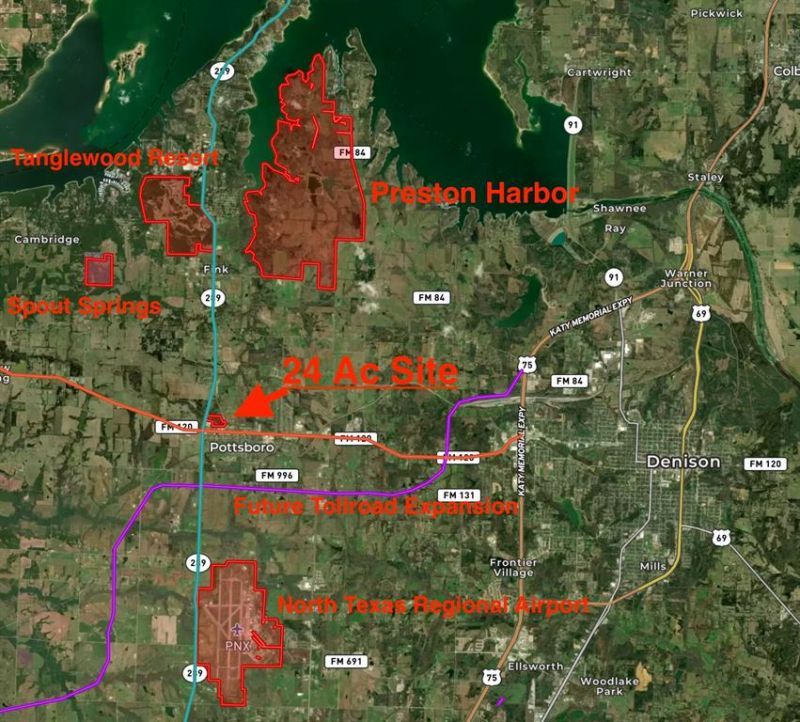 This 24 acre site is located on the NE corner of the primary intersection of Pottsboro at State Highway 289 and FM 120. The site is zoned B2, but previously was approved by the city for a planned development with zoning to include multi-family, townhome and retail.This site has all utilities on site, a clean phase I, wetland delineation and additional engineering completed. The site is approximately 1 mile from the Pottsboro High School, 3 miles from North Texas Regional Airport and 4 miles from Tanglewood Resort and 6 miles from US Hwy 75.